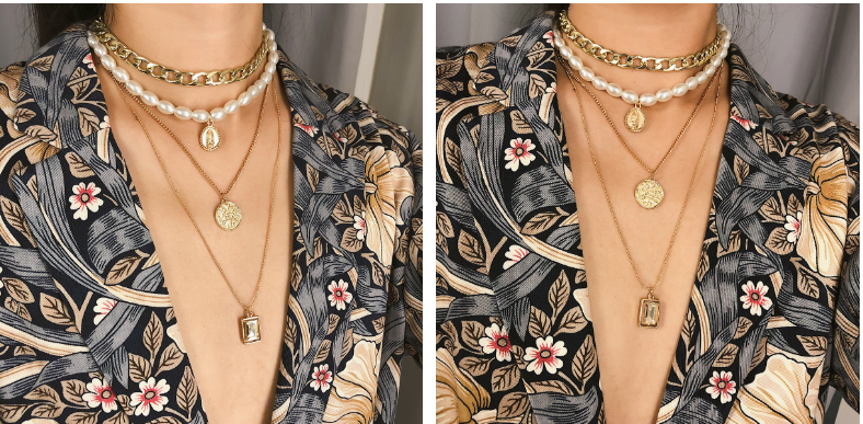 复古钱币宝石项链毛衣链女 个性气质多层珍珠项链